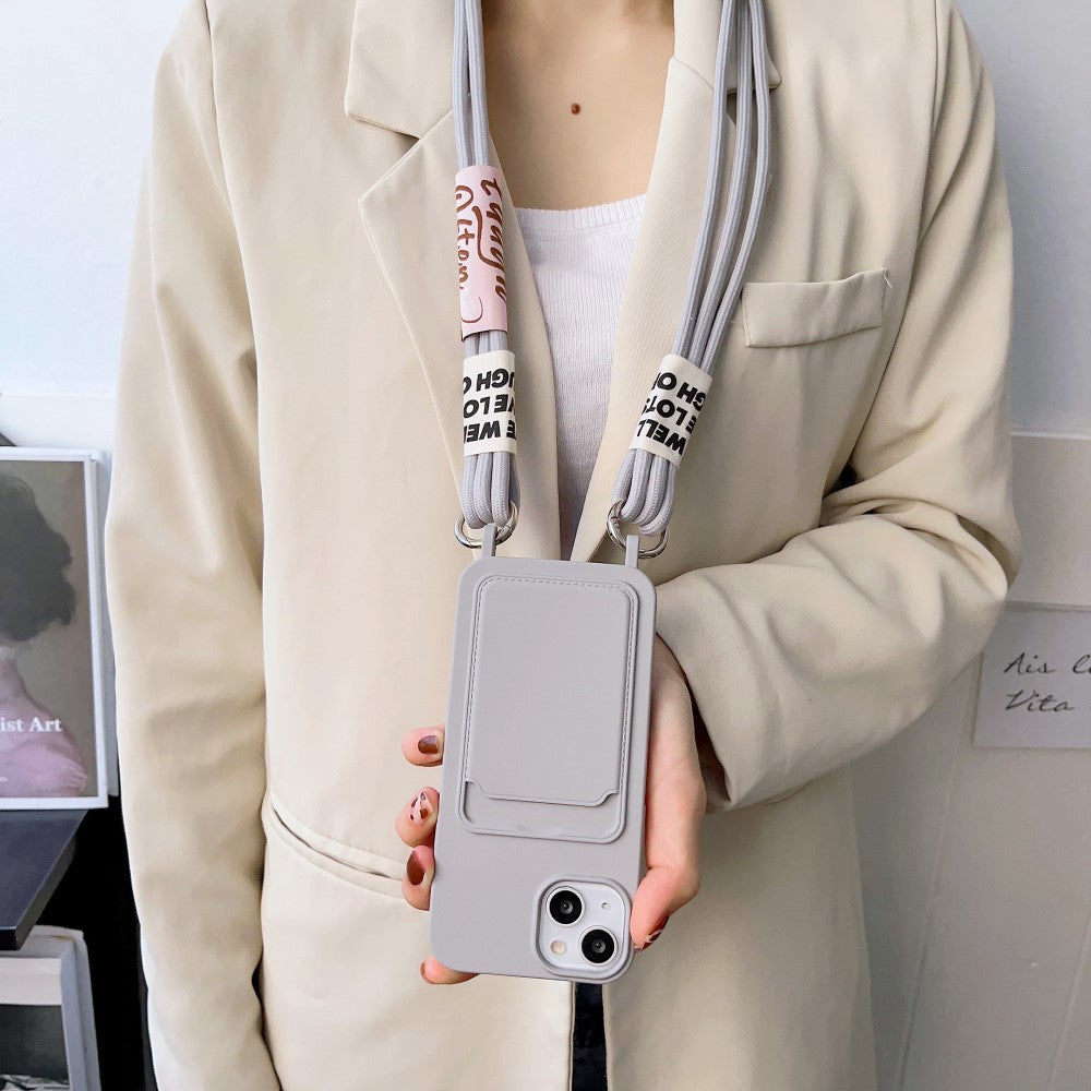 Étui en silicone liquide pour iPhone 15 Plus avec fente pour carte et dragonne - Beige