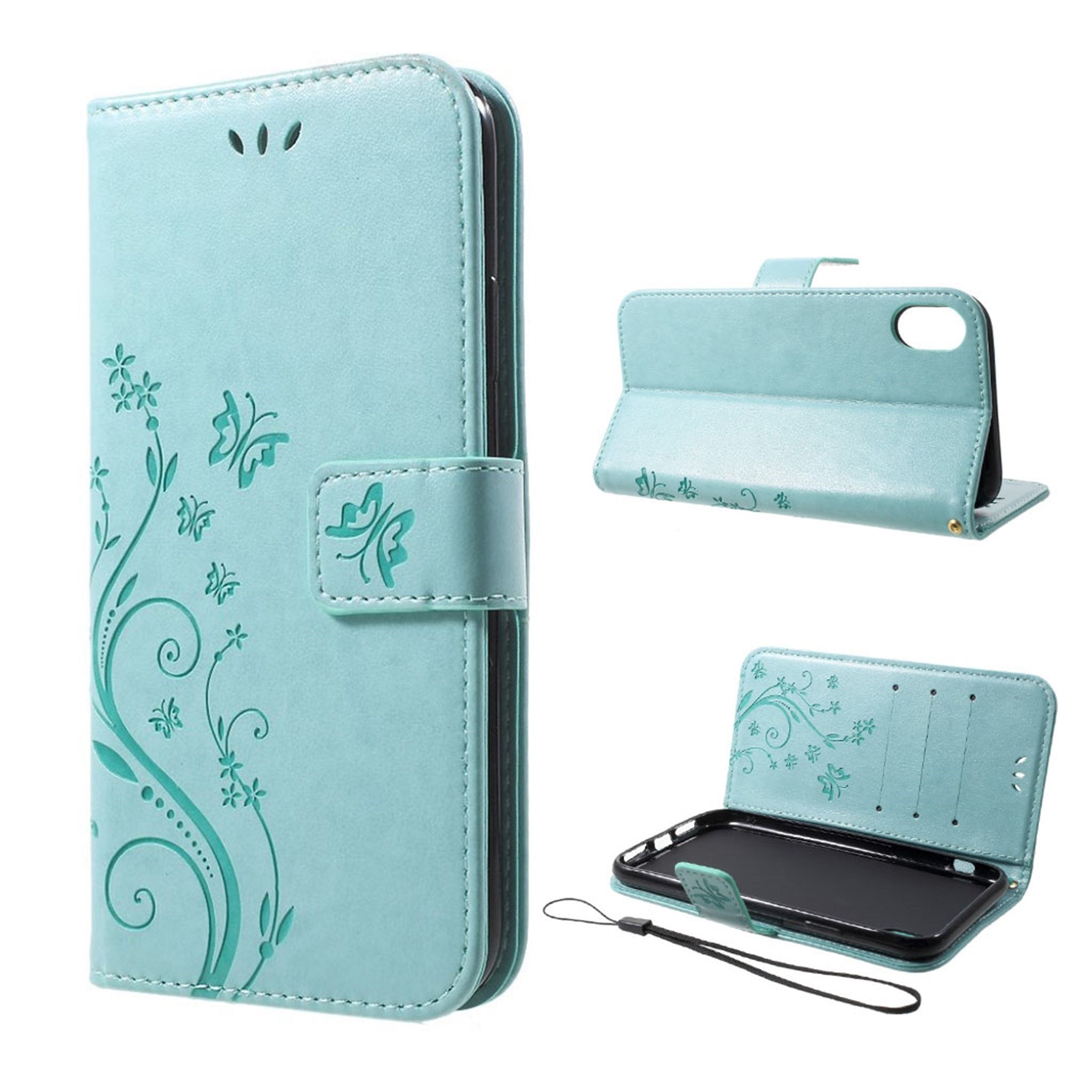 iPhone Xr beskyttelses deksel av syntetisk skinn med sommerfugl og blomster avtykk - Cyan