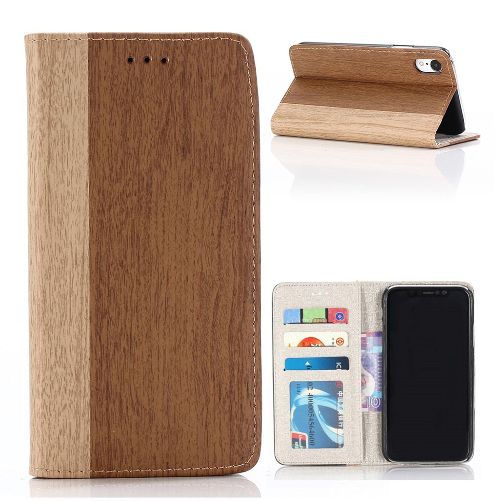 Coque à rabat en cuir texture bois pour iPhone Xr - Marron