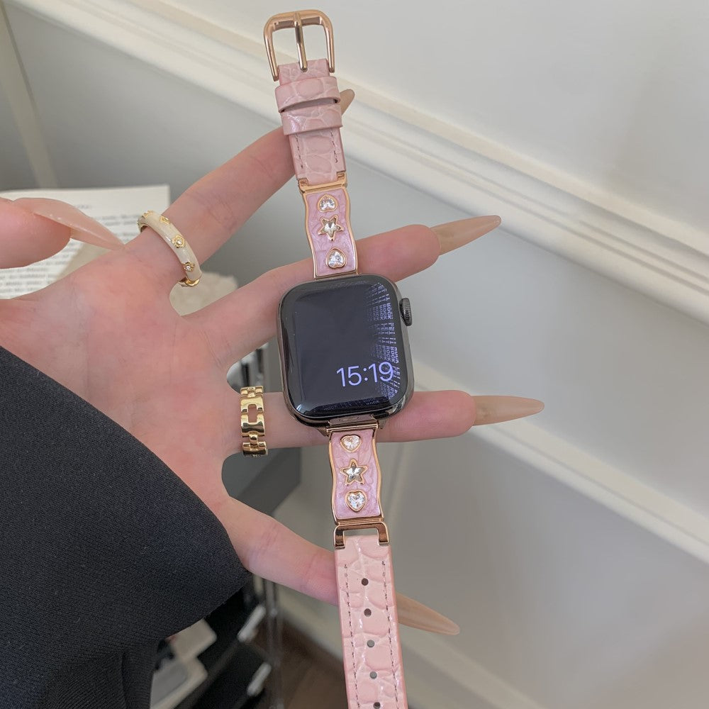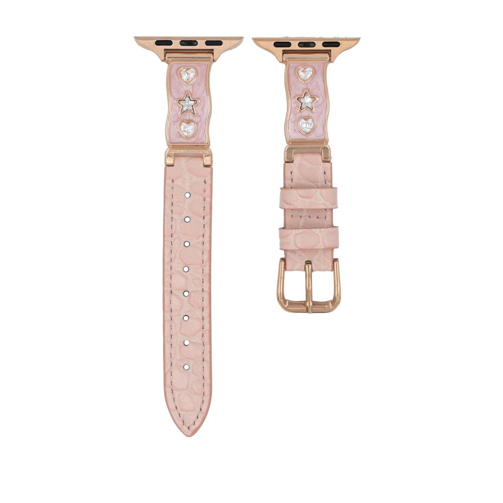Bracelet de montre Apple Watch Series 1-9 49 mm - 45 mm - 44 mm - 42 mm Décor zircon Bracelet en cuir de vachette véritable - Rose