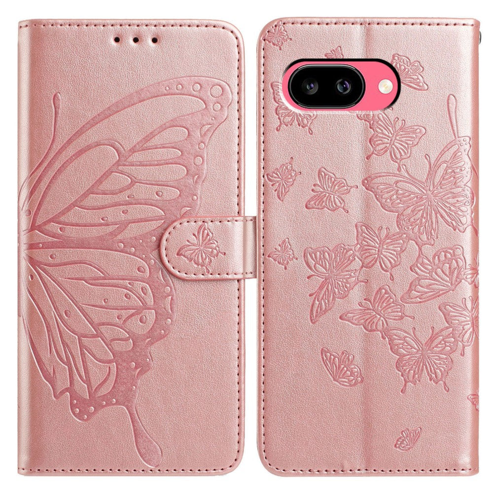 Étui Google Pixel 9a Portefeuille avec support imprimé papillon Étui à rabat en cuir vegan avec sangle - Or Rose