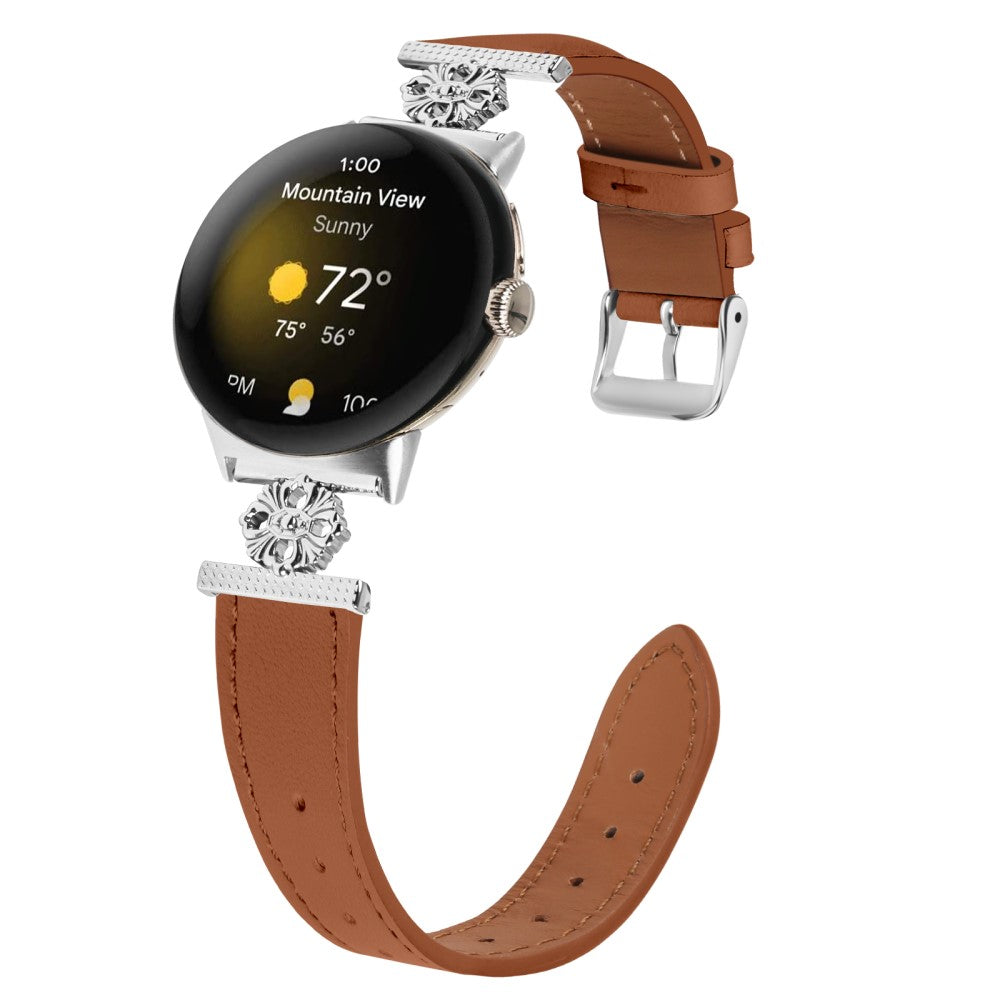 Google Pixel Watch 2 Watch Band Genuine Cow Leather Flower Decor Adjustable Strap - Brown