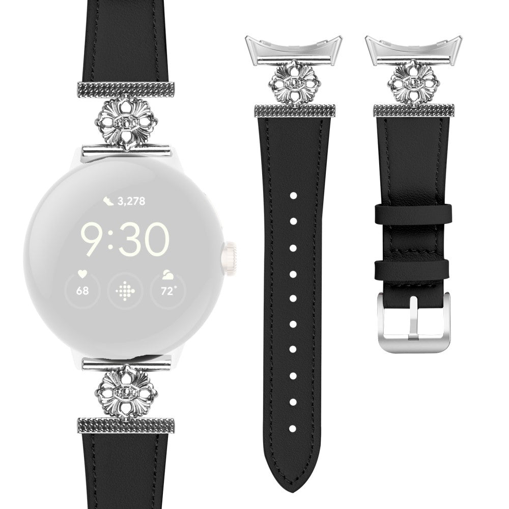 Google Pixel Watch Genuine Cow Leather Band Flower Decor Adjustable Strap - Black