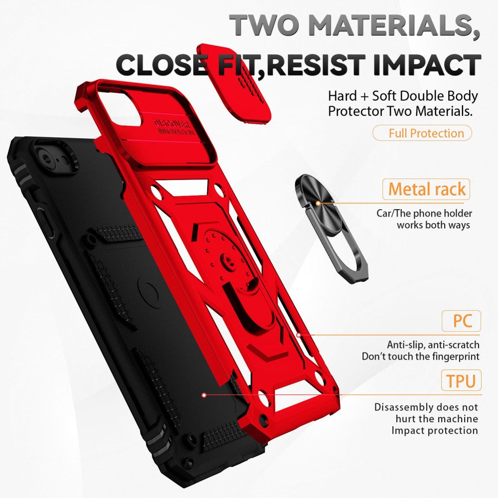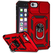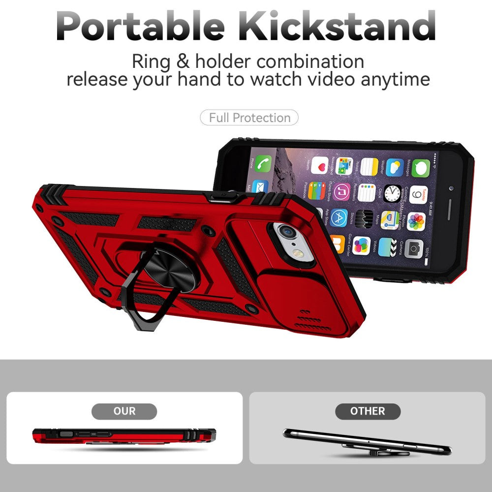 Pour iPhone SE (2022)/SE (2020)/8/7 4,7 pouces Coque de téléphone anti-poussière Ring Kickstand Hybrid PC TPU Phone Shell with Slide Camera Protection Cover - Rouge